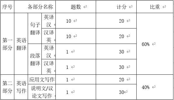 試卷由兩部分構成:第一部分翻譯,要求學生翻譯一定難度的句子和段落。題型:英譯漢、漢譯英。第二部分寫作,要求學生能根據題目要求,寫出長度為50-60個單詞左右的應用文,如便條、通知和請帖等。能根據題目、提綱或圖表數據等,寫出長度為200-300個單詞左右的說明文或議論文短文。